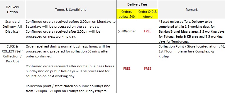 - Delivery available to all districts across Brunei Darussalam (except Kg. Ayer / Off Shore stations).