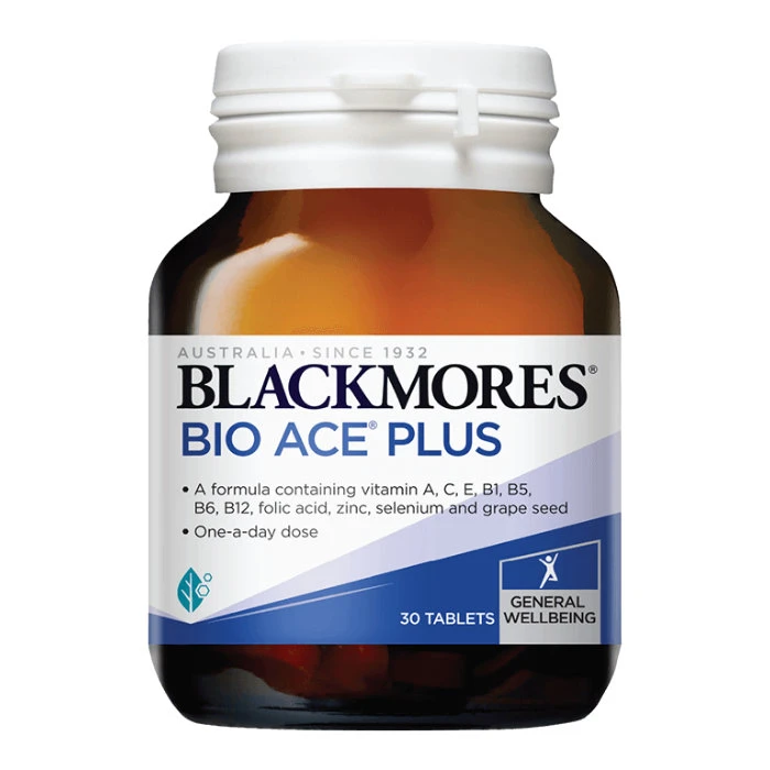 Blackmores Bio ACETM Plus is a formula containing Vitamin A, C, E, B1, B5, B6, B12, folic acid, zinc, selenium and grape seed for the maintenance of good health. Pollutants, sun, stress, poor diet, alcohol and some medications can cause our bodies to overproduce free radicals which can harm the body.