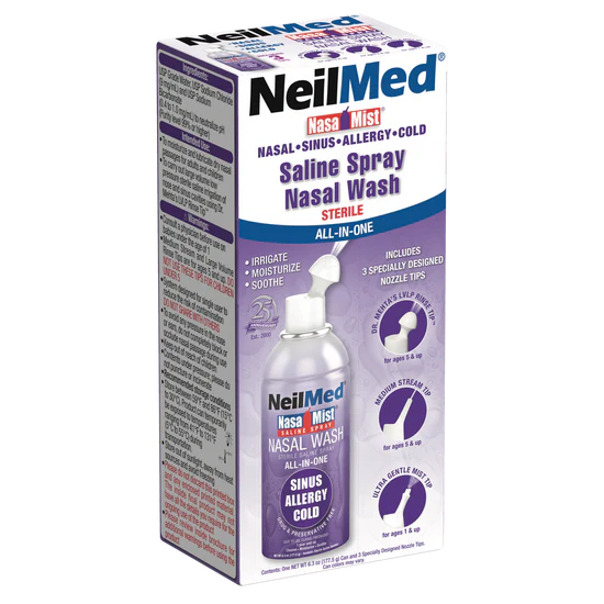 NasaMist Saline Spray All-In-One is a nasal moisturizer and saline rinse, all in one can. Soothe, moisturize and cleanse using a specially designed Large Volume Rinse Tip.