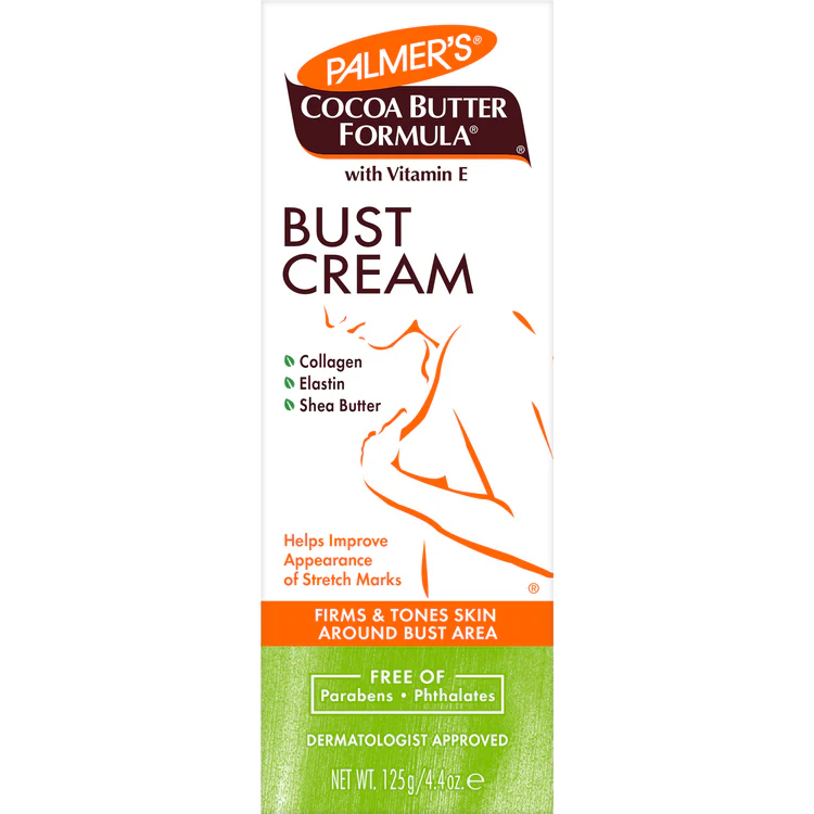 Palmer’s Cocoa Butter Formula Bust Cream is a specially formulated cream that smoothes on like a gel. It will firm and tone your bust area even after pregnancy and weight loss. Made with a unique blend of pure Cocoa Butter, Shea Butter and Vitamin E, to maximize your skin’s moisturization, while Collagen, Elastin and other proven ingredients help support the skin around the bust area and increase tone and firmness.