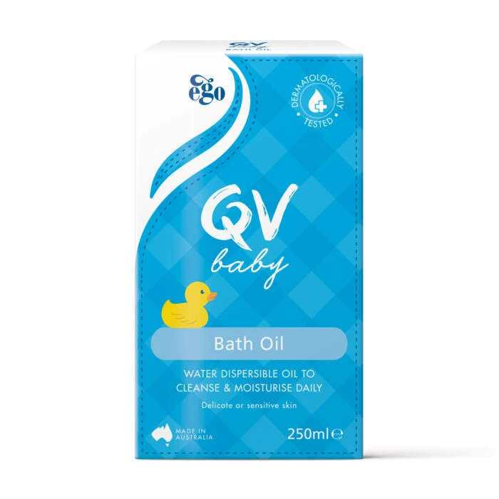 - QV Baby Bath Oil is a clear, non-greasy formula now with added Vitamin E, helps visibly rejuvenate large areas of dry or sensitive skin.